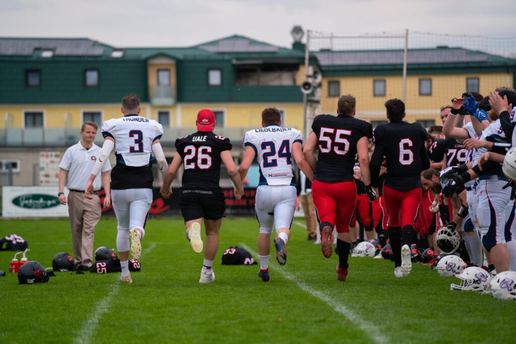 Angesichts der ihnen davonlaufend Zeit entscheiden sich die Lions für einen Onsidekick um wieder selbst das Angriffsrecht zu erhalten. Darauf ist die KO Return-Unit aber vorbereitet Paul Kriener sichert den Ball und damit das Ballrecht für Amstetten. Jetzt geht es Schlag auf Schlag, Amstetten nutzt das kurze Feld im ersten Play ein Run über außen von Benjamin Lidlbauer 50 Yards in die Endzone. TD Thunder die Nummer 4 an diesem Tag für die Nummer 24 von Amstetten. Diesmal geht der Extra Punkt vorbei, neuer Spielstand 44:28 Im Gegenzug kassiert man einen KO Return TD der Nummer 88 Simon Monai er trägt den Ball über 80 Yards zum TD für die Lions. Eine 2pt Conversion der Lions misslingt. 44:34 Die logische Folge ein erneuter Onsidekick. Wieder ist die Unit der Thunder auf dem Posten und Andreas Kattner recoverd diesen. Jetzt hat es die Thunder Offense nicht mehr eilig Clockmanagment ist angesagt. Es werden noch 2 1st Downs aufgepickt. In der Redzone der Lions wirft Lukas Kerschbaummayr bei 3. Versuch den Ball in die Endzone und so setzt Jakob Zeitlhofer den Schlusspunkt mit seinem hochverdienten TD. Der Extra Punkt sitzt 51:34 Den Lions bleiben noch ein paar Sekunden auf der Uhr in dehnen sie aber nicht noch weitere Punkte erzielen können. Ein harter Sieg in dem man von den mit Herz aufspielenden Lions voll gefordert wurde.