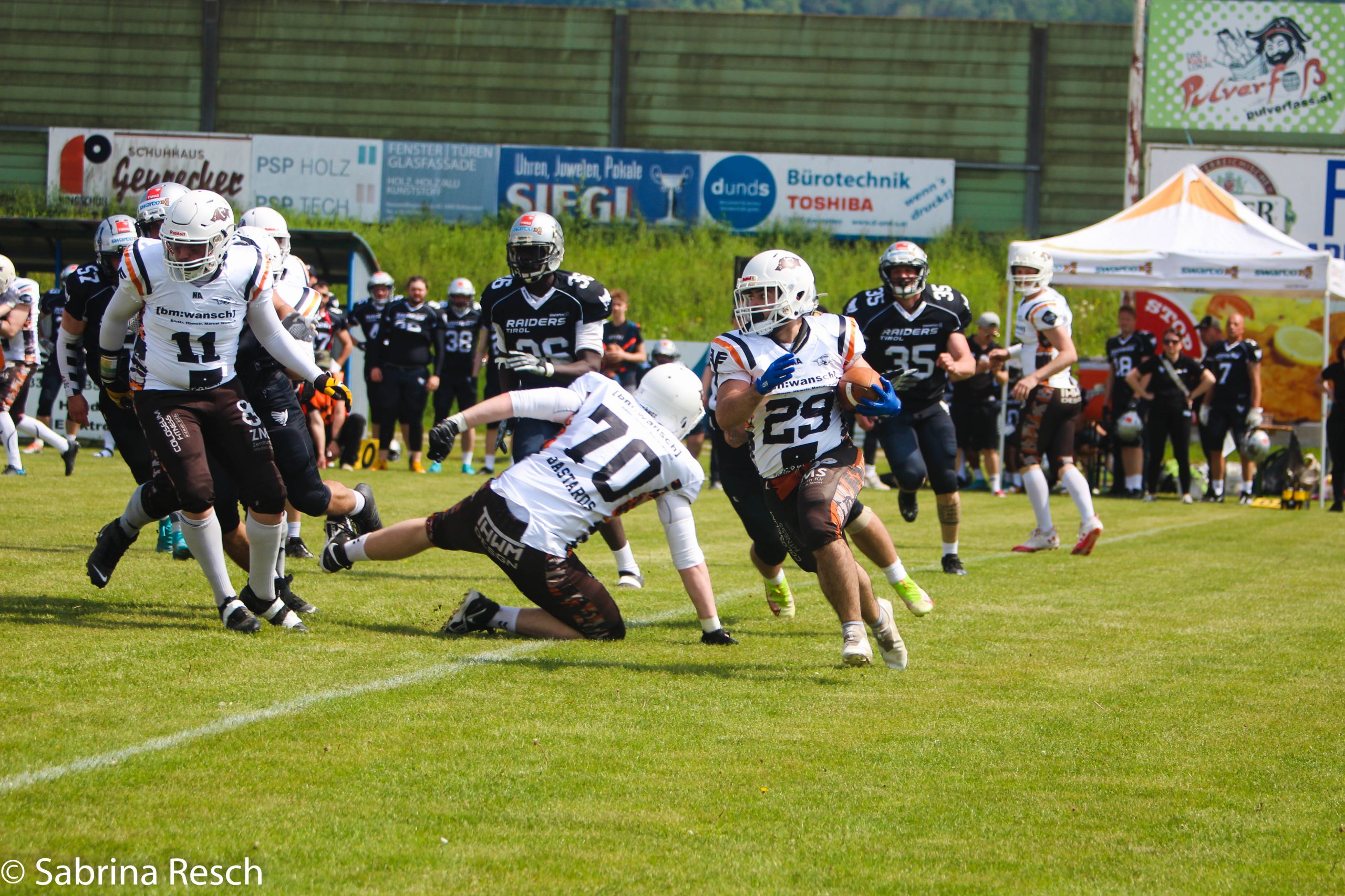 Vergangenen Sonntag durften die [bm:wansch] Mostviertel Bastards das Team II der Swarco Raiders Tirol am Danube Field in Sarling begrüßen. Das Duell versprach bereits vorab hochspannend zu werden, ging es doch um den zweiten Tabellenplatz und um einen weiteren Schritt Richtung Playoff Runde. Die Mostviertler starteten mit ihrer Offense ins Spiel, mussten jedoch bereits nach drei Versuchen ihr Ballrecht wieder an die Tiroler abgeben. Diese konnten die bärenstarken Defense der Bastards jedoch auch nicht aus der Ruhe bringen und mussten ihrerseits den Ball wieder den Mostviertlern überlassen. Diesmal konnten die Bastards das Feld mit einigen ansehnlichen Läufen überbrücken und den Drive mit einem Touchdown Run durch Quarterback Manuel Vielhaber abschließen (7:0, PAT good). Nach dem nächsten three-and-out durch die Tiroler marschierte das Heimteam wieder über das Feld. Kurz vor der Endzone hielt die Defense der Gäste jedoch und man musste ein Fieldgoal versuchen – ohne Erfolg. Dieser Ablauf wiederholte sich dann noch ein zweites Mal und nun begann der junge Kader der Bastards auch zunehmend nervös zu werden. Man konnte die Raiders zwar sowohl in der Defense als auch in der Offense weitgehen dominieren, man verwandelte dies jedoch nicht in Punkte – und das sollte sich später noch rächen.