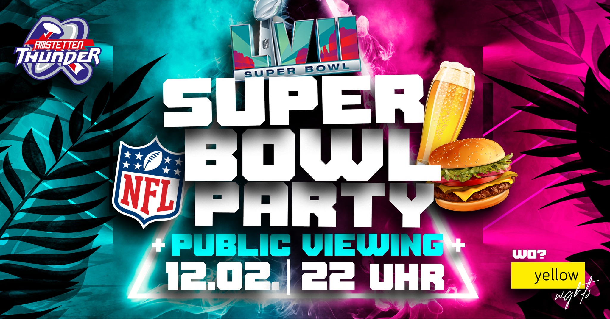 Gemeinsam mit den Ultimate Amstetten Thunder könnt ihr beim Public Viewing im Yellow Nights den diesjährigen Super Bowl in der Nacht vom 12. auf den 13. Februar live mitverfolgen.